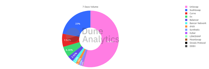 Tak wysoka popularność daje Uniswap 54% udział w rynku DEX. Jednak pomimo jego dominacji, nadal istnieje silna konkurencja ze strony SushiSwap i jemu podobnych.