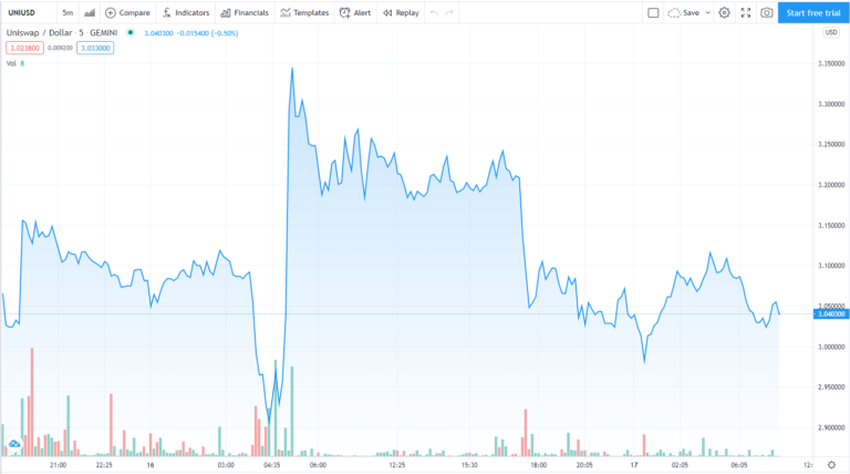 Natywny token UNI firmy Uniswap zanurkował z resztą tokenów DeFi w ciągu ostatnich kilku tygodni, ale udało mu się ponownie przekroczyć 3 USD, zgodnie z Tradingview.com.