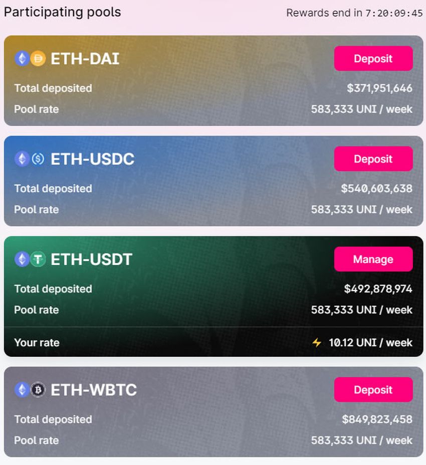 Cztery pule płynności tokenów UNI posiadają lwią część płynności na Uniswap. Około 2,25 miliarda dolarów zostało zdeponowanych w ETH, stablecoinach i BTC w tych czterech pulach, przy czym najpopularniejszy jest wBTC, który ma 38% całości.