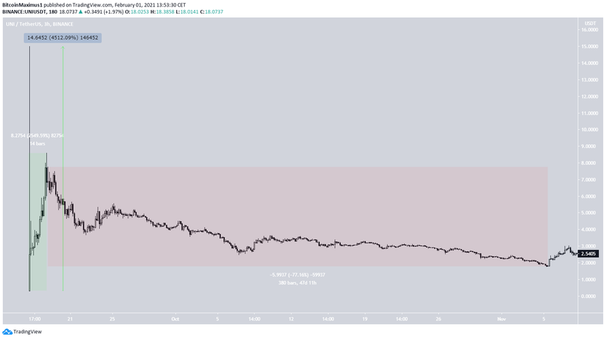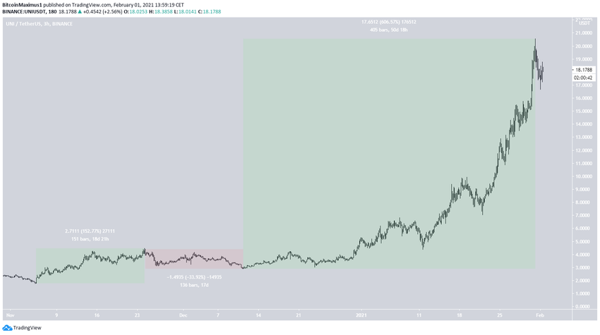 Od tego czasu UNI gwałtownie wzrasta, zyskując 600% w ciągu 50 dni w niemal parabolicznym tempie. W dniu 4 lutego osiągnął rekord wszech czasów (ATH) na poziomie 21,60 USD.