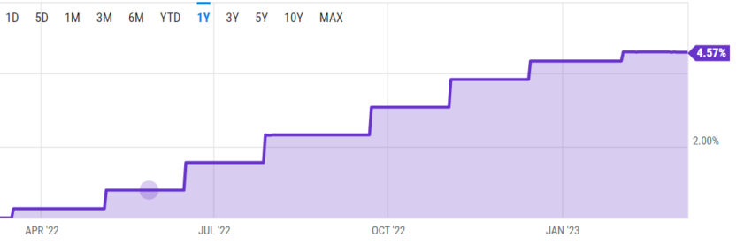W ciągu ostatniego roku bank centralny podniósł stopy procentowe o około 4,5%.