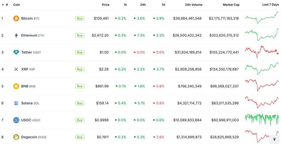 W momencie pisania, Bitcoin rośnie i handluje na poziomie 109 406 USD, a altcoiny również zaczynają się poruszać w górę. Dane z CoinGecko pokazują, że Ethereum wzrosło o ponad 7% w ciągu ostatnich 24 godzin, podczas gdy Solana (SOL) i Dogecoin (DOGE) wzrosły o ponad 5%.