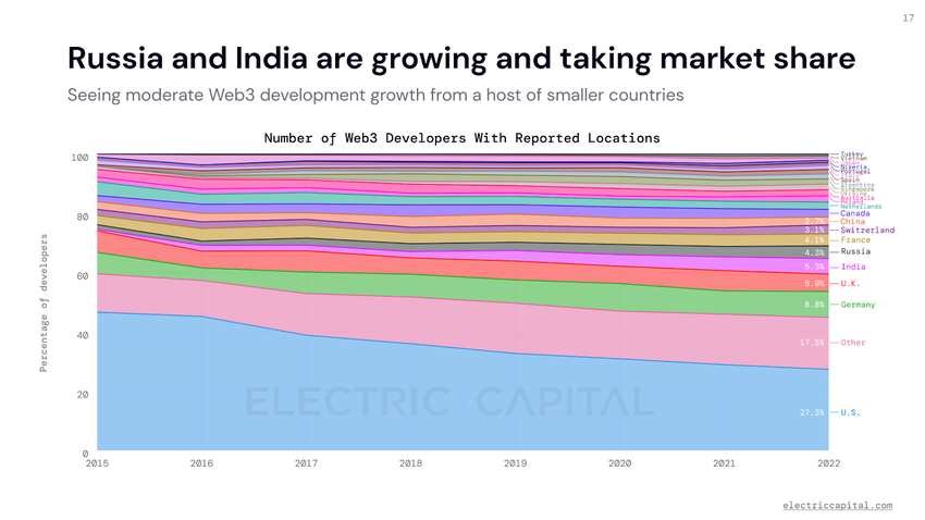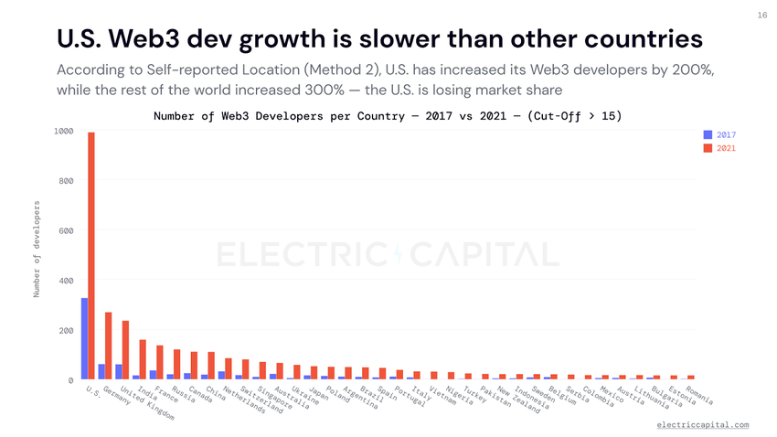 Stany Zjednoczone tracą ogólny udział w rynku pod względem deweloperów Web3. Tak wynika z danych firmy Electric Capital zajmującej się kapitałem wysokiego ryzyka w branży kryptowalut.