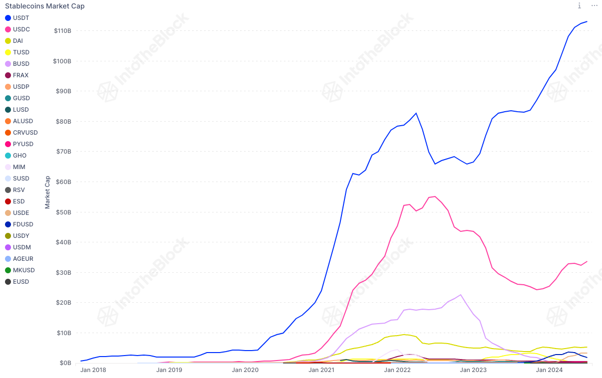 SponsoredRośnie nie tylko USDT. Cały rynek stablecoinów odnotował imponujący wzrost, z 137,86 miliardów dolarów w grudniu 2022 roku do około 150 miliardów dolarów w lipcu 2024 roku. Wzrost ten odzwierciedla rosnące zaufanie i przyjęcie stablecoinów jako zaufanej części ekosystemu kryptowalut.