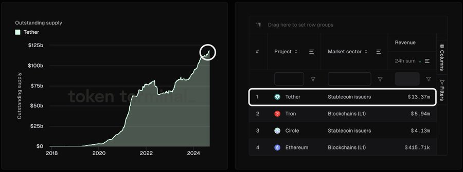 Według Token Terminal działania Tether przynoszą efekty finansowe, generując ponad 13 mln USD dziennego przychodu.