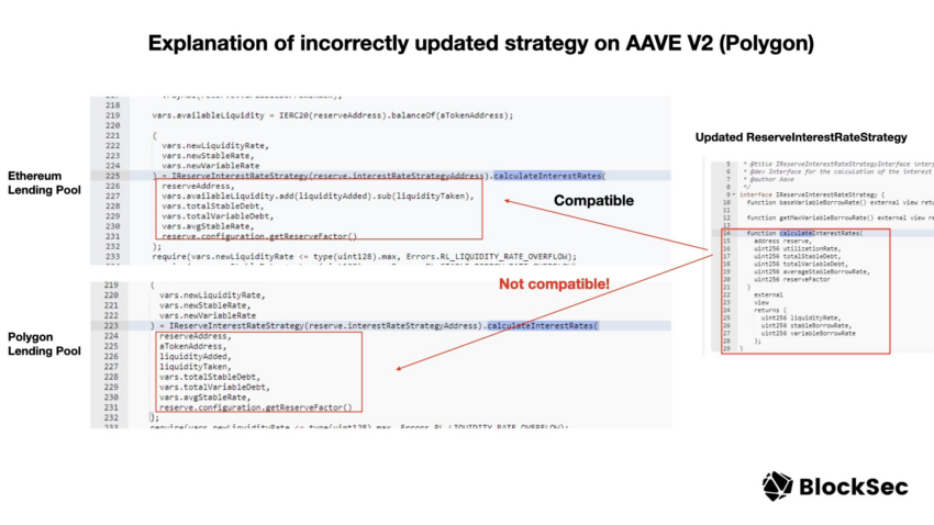 Firma BlockSec, zajmująca się bezpieczeństwem blockchain, poinformowała 19 maja, że problem wynikał z kontraktu ReserveInterestRateStrategy wdrożonego na Polygon. Aktualizacja miała umożliwić bardziej efektywną krzywą stóp procentowych na Aave V2 i zoptymalizować wykorzystanie platformy.