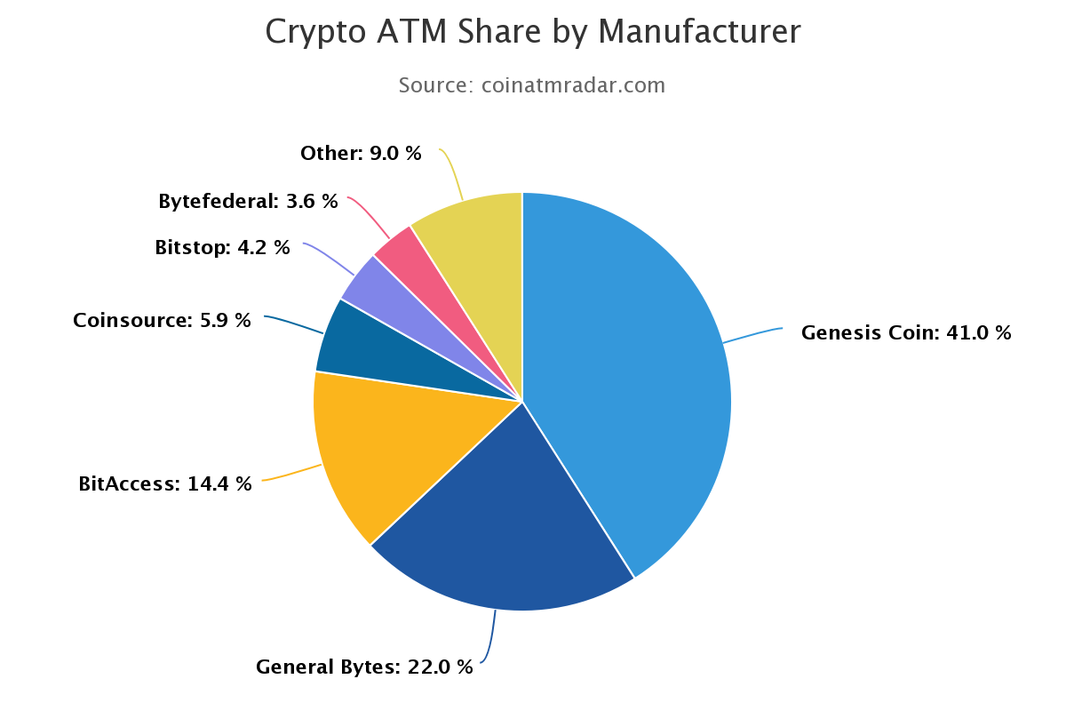Największymi producentami urządzeń stacjonarnych do wymiany na linii krypto-fiat są oczywiście Amerykanie. Firma Genesis Coin wybija się ponad wszystkich z udziałem 40% w światowej produkcji. Kolejne miejsce, o dziwo, zajmuje czeska firma General Bytes z wynikiem 22%, jednak dalsze pozycje to znowu dominacja USA.
