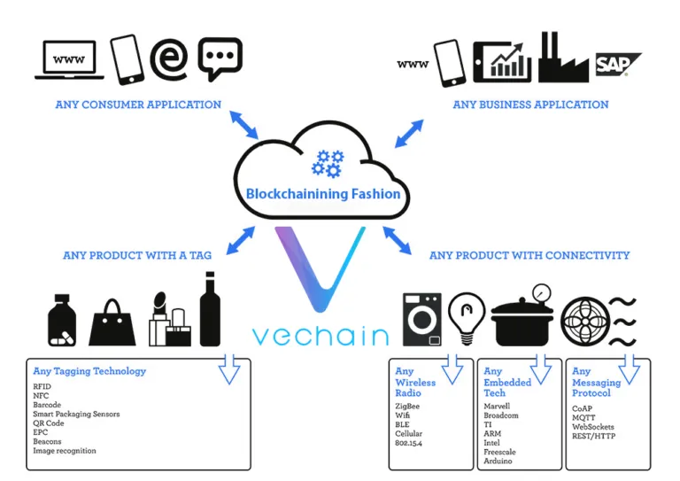 VeChain wykorzystuje swój łańcuch blokowy głównie do zapewnienia identyfikacji radiowej (RFID). Może on być wykorzystany jako część struktury Internet-of-Things, planowania łańcucha dostaw, a także do określania pochodzenia unikalnych towarów.