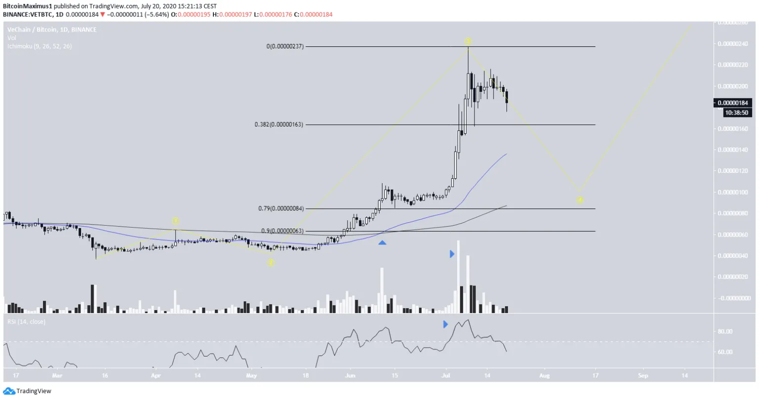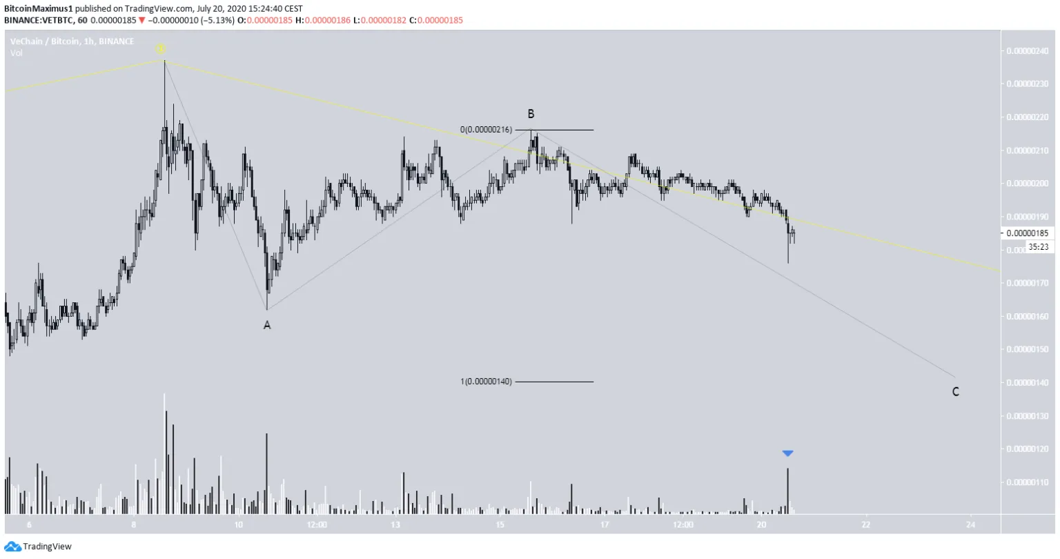 Od szczytu z dnia 7 lipca VET koryguje się w formacji A-B-C. W chwili pisania tego tekstu cena wydawała się kończyć falę C, która może zakończyć się w pobliżu 140 satoshi, w zależności od długości fali A.