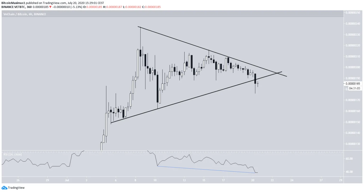Bliższe spojrzenie na cenę VET pokazuje, że od dnia 7 lipca widoczny był symetryczny trójkąt. Jednak w momencie pisania tego tekstu VET właśnie wyłamał się z tego wzorca.
