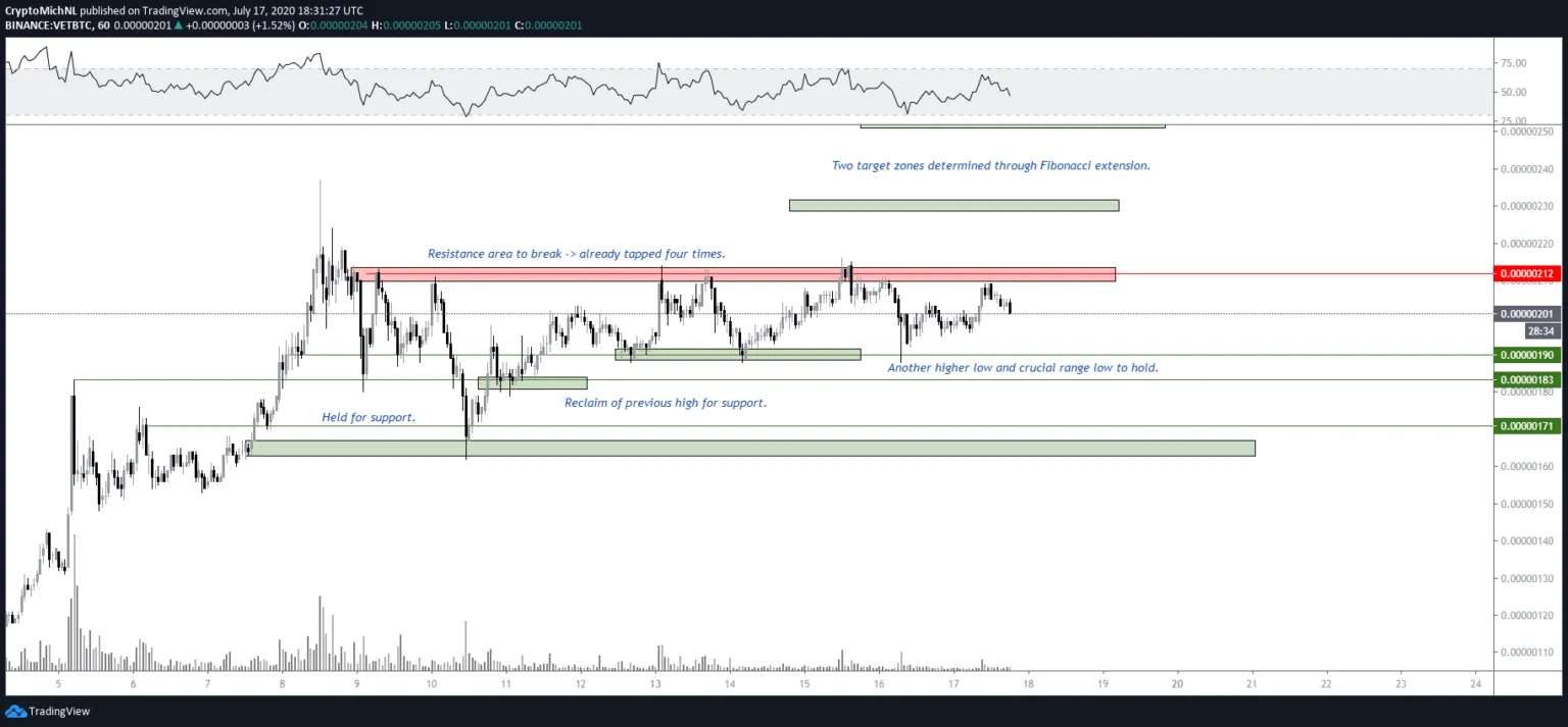 Sponsored SponsoredKryptowalutowy trader @CryptoMichNL narysował wykres VET, stwierdzając, że jeśli cena zdoła stworzyć kolejne wyższe dno, powinna wybić się powyżej obecnego obszaru oporu, celując w 230 satoshi.