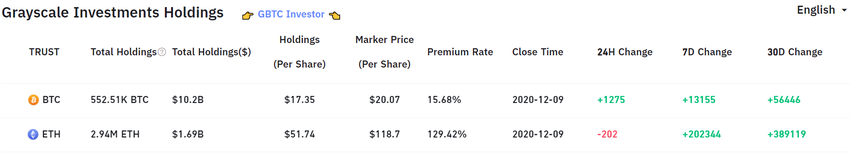 Samozwańczy entuzjasta blockchain o imieniu Mark Rex opublikował na Twitterze zrzut ekranu arkusza kalkulacyjnego. Dane sugerują, że Grayscale kupiła 9 grudnia 2020 roku kolejne 1276 BTC i 13 232 BTC w ciągu ostatniego tygodnia.