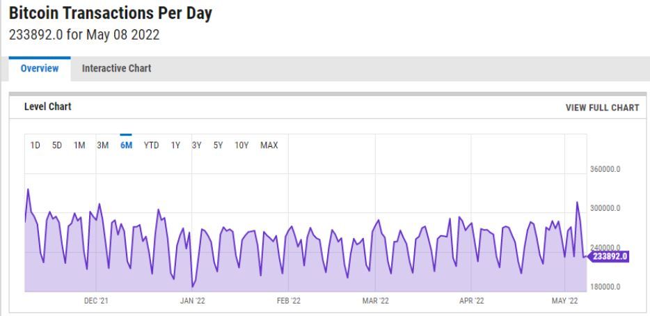 Sponsored SponsoredDane z platformy analitycznej on-chain, Ycharts (pokazane powyżej), wskazują, że 8 maja 2022 r. miało miejsce 233 892 transakcji BTC. Jest to średnia ilość dziennych transakcji BTC od początku roku.
