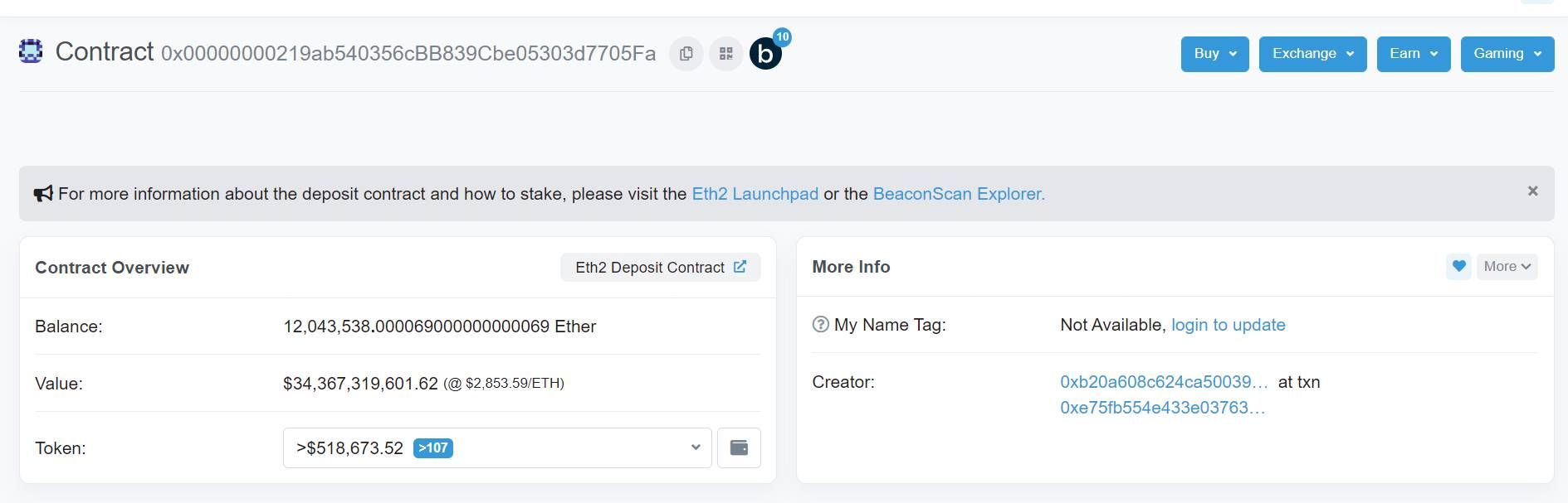 Zgodnie z obliczeniami, łączna wartość zablokowanego Etheru w kontrakcie Eth2 szacowana jest na około 34,5 miliarda dolarów. Kontrakt depozytowy o nazwie Beacon Chain został uruchomiony w listopadzie 2020 roku. Obecnie znajduje się w nim ponad 10% całkowitej podaży ETH w obiegu.