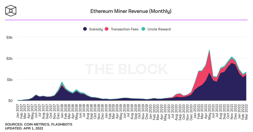 Podczas gdy górnicy wydobywający Bitcoina uzyskali w marcu przychody w wysokości 1,21 mld dolarów, górnicy wydobywający Ethereum wygenerowali 1,34 mld dolarów. Podobnie jak w przypadku Bitcoina, przychody Ethereum wzrosły o 7% w stosunku do lutego.