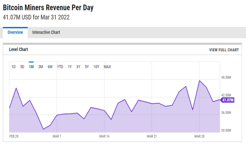 Choć liczba ta wydaje się niska, gdy weźmie się pod uwagę popyt na Bitcoina, całkowity przychód z jego wydobycia wzrósł w porównaniu z lutym 2022 roku. Całkowity przychód w marcu wzrósł o 14% do około 150 milionów dolarów.