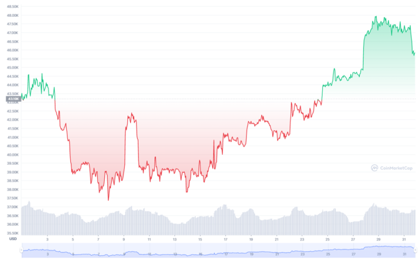 Bitcoin rozpoczął 1 marca notowania na poziomie 43 194,50 dolarów. BTC osiągnął miesięczny szczyt 48 022,29 dolarów, a 31 marca zakończył miesiąc na poziomie 45 538,68 dolarów. Oznacza to wzrost o 11%.