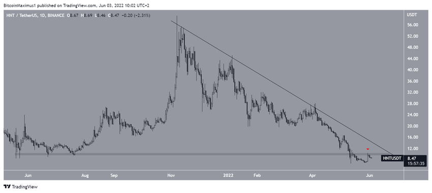 HNT spada poniżej linii opadającej linii oporu od 7 listopada. Ruch w dół doprowadził do minimum 6,24 USD 12 maja.