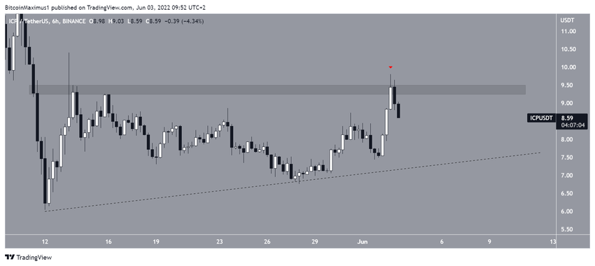 ICP spada, odkąd odrzucono go 2 czerwca (czerwona ikona). Ruch w dół potwierdził, że obszar 9,40 USD jest oporem.