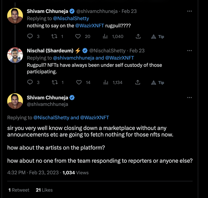 Współzałożyciel Shetty wyjaśnił na Twitterze, że zamknięcie platformy nie jest rug pullem, ponieważ NFT są zawsze pod opieką uczestników. Niektórzy twórcy uważają jednak, że zostały one porzucone.