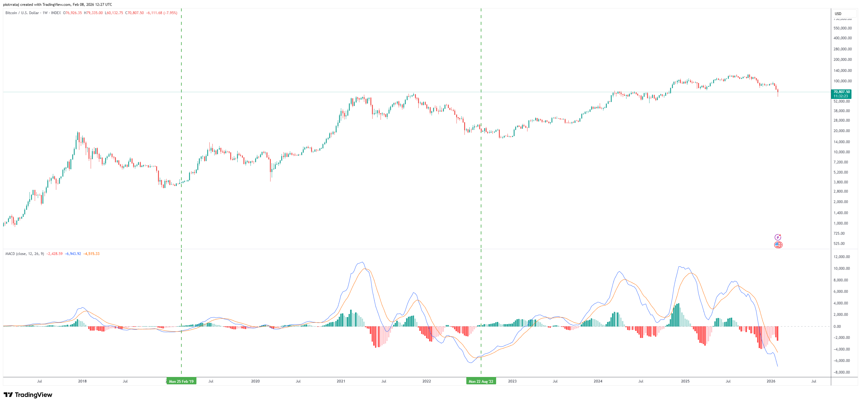 Rataj zwraca uwagę na układ długoterminowych średnich kroczących. Kurs Bitcoina niemal dotarł do MA200, a historycznie rynek lubił w takich momentach schodzić jeszcze niżej – w kierunku MA300, która obecnie znajduje się w okolicach 50 000 USD. To nie jest prognoza krachu, ale raczej sygnał, że przestrzeń do dalszego schłodzenia rynku wciąż istnieje.