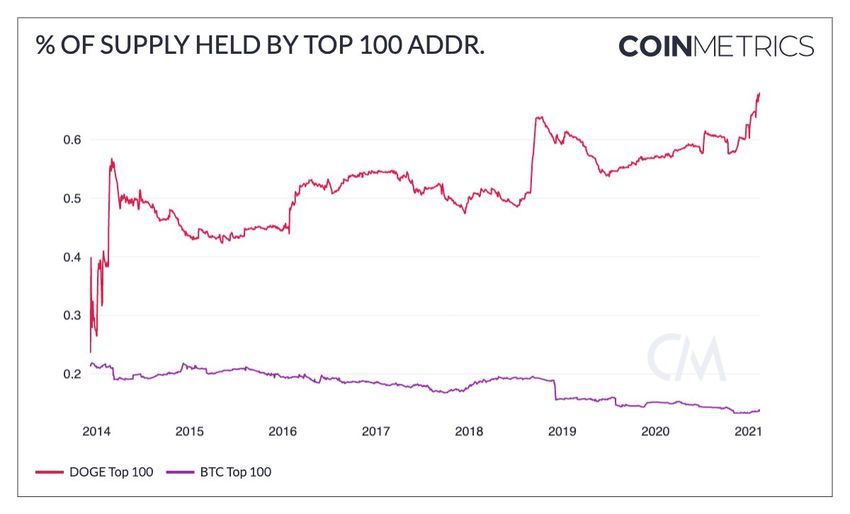 Badania Coin Metrics wykazały, że 68,1% zasobów DOGE jest skoncentrowanych w rękach 100 największych portfeli, co potwierdza wcześniejsze twierdzenia Elona Muska.