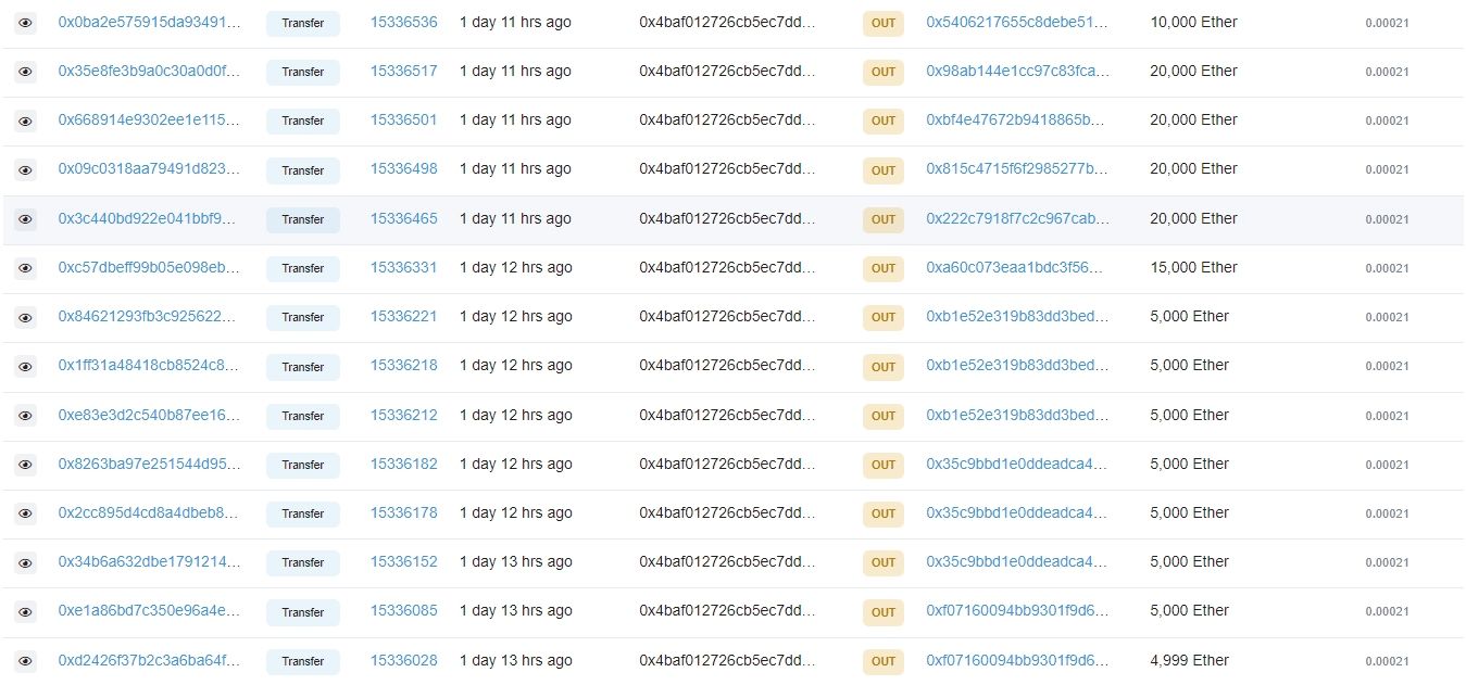 Użytkownik rozdzielił środki pomiędzy różne portfele, wysyłając łącznie 14 transakcji o wartości 5000, 10 000 i 20 000 ETH.