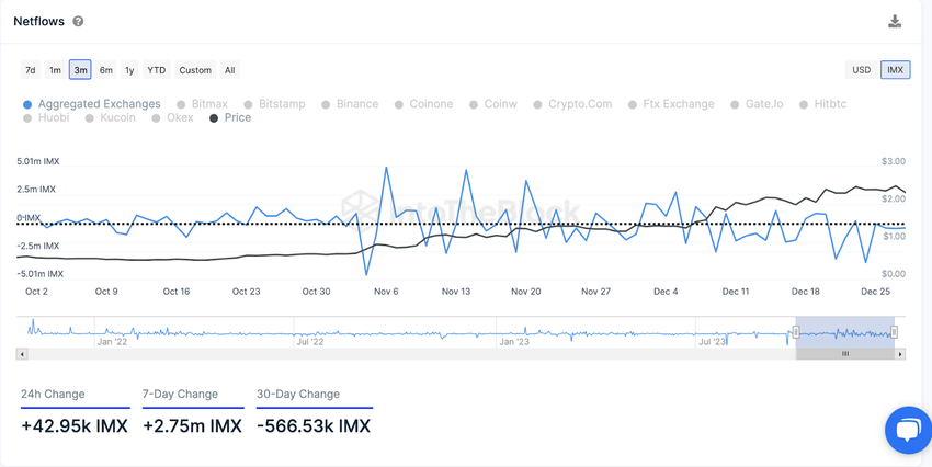 W ciągu ostatnich 30 dni saldo scentralizowanych giełd zmniejszyło się o ponad 500 000 tokenów IMX. Jednak ostatnio ten trend nadwyżki wypłat zmienia się w nadwyżkę depozytów. Wynika to z faktu, że po imponującym wzroście IMX wielu inwestorów zamierza zaksięgować zyski ze swoich udziałów.