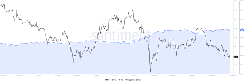 Brian Quinlivan, główny analityk w Santiment, zauważa znaczący wzrost akumulacji przez wieloryby w ciągu ostatnich trzech miesięcy. Według danych od Santiment, portfele Bitcoina trzymające przynajmniej 10 BTC zwiększyły od czerwca swoje saldo o 34 200 BTC – warte około 2,15 mld USD – pomimo rynkowej zmienności. Quinlivan powiedział: