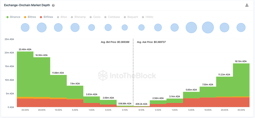 Analizując poniższy wykres, niedźwiedzi traderzy są gotowi sprzedać 7,6 mln monet, gdy ADA zyska 10%. Oznacza to, że byki ADA prawdopodobnie napotkają pierwszy opór w okolicach poziomu 0,40 USD.