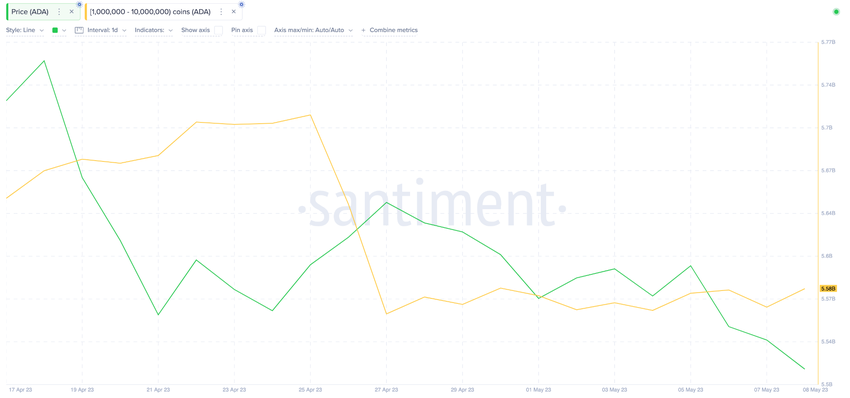 Poniższy wykres pokazuje, jak wieloryby Cardano z saldami od jednego miliona do dziesięciu milionów ADA nieznacznie zwiększyła swoje udziały. Co ciekawe, dzieje się to podczas obecnego trendu spadkowego.