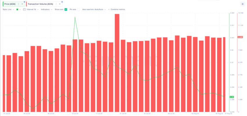 SponsoredPoniższy wykres Santiment pokazuje, że między 1 lipca a 7 sierpnia wolumen transakcji ADA wzrósł o 32% z 7,32 mld do 9,63 mld.
