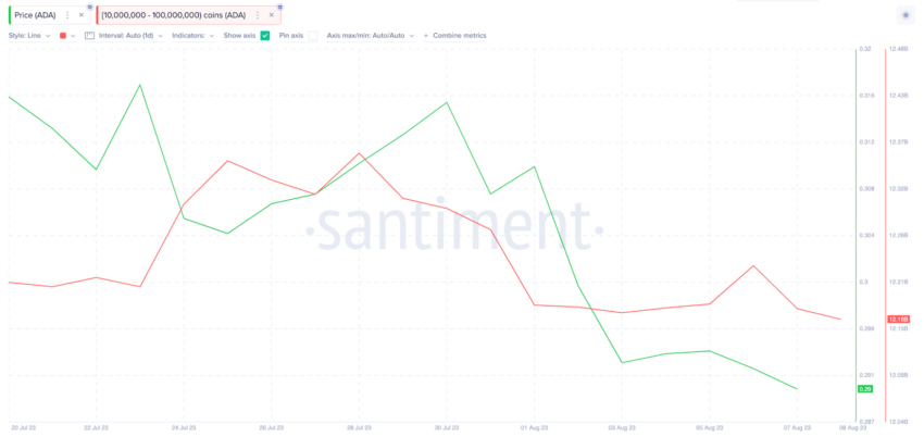 Ponadto dane onchain pokazują, że adresy z saldami od 10 do 100 milionów monet aktywnie pozbywają się Cardano. Pod koniec lipca posiadały one 12,27 mld ADA, a na zamknięciu notowań w dniu 7 sierpnia liczba ta spadła do 12,17 mld. Przy wartości rynkowej 0,29 USD, wartość tokenów sprzedanych przez wieloryby wyniosła około 29 mln USD.