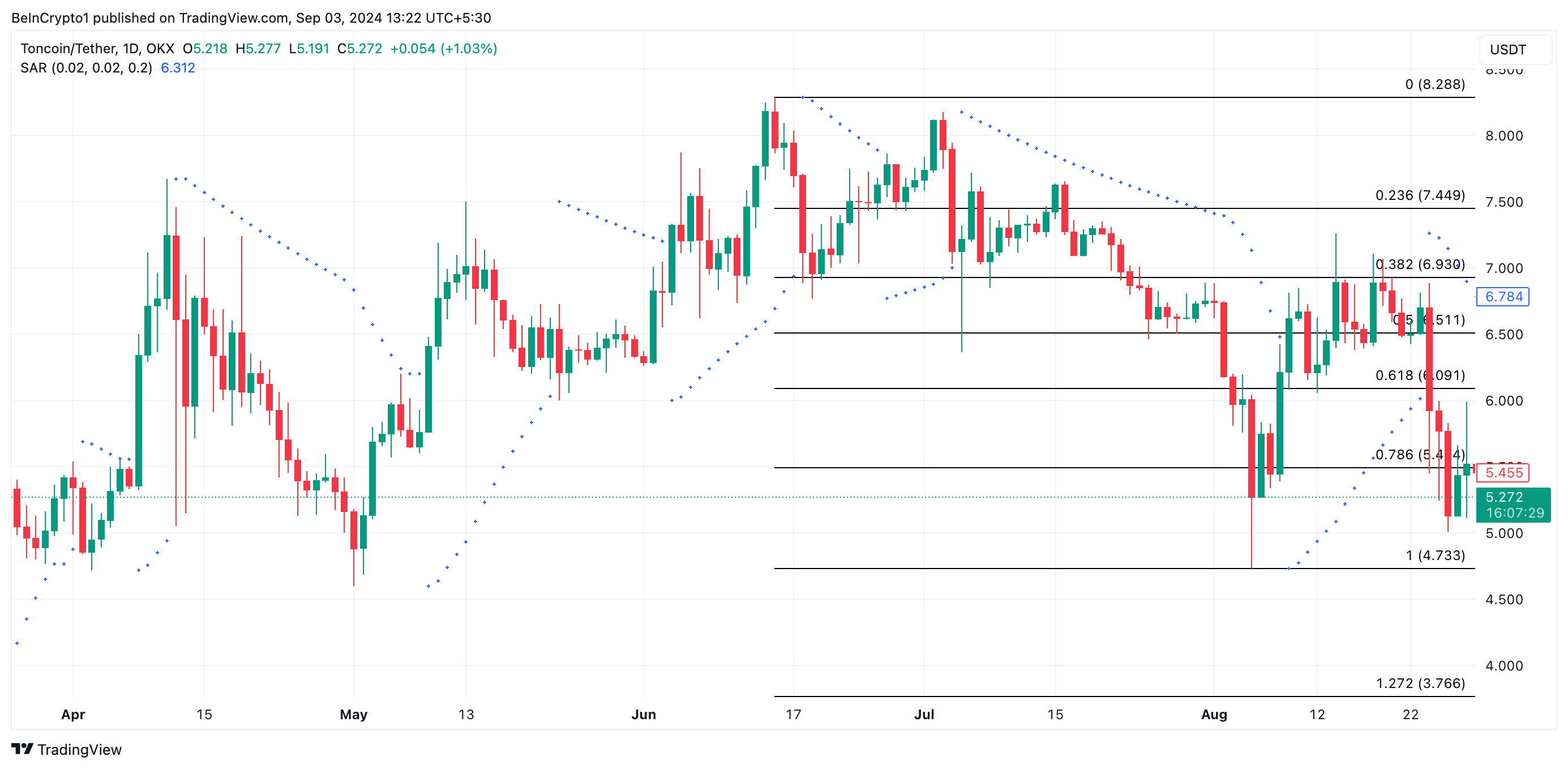 Ponadto kropki wskaźnika Parabolic Stop and Reverse (SAR) TON znajdują się powyżej jego ceny. Wskaźnik SAR mierzy kierunek trendu aktywa i identyfikuje potencjalne punkty odwrócenia. Gdy jego kropka znajduje się powyżej ceny, rynek jest w trendzie spadkowym, a spadek ceny może być kontynuowany.