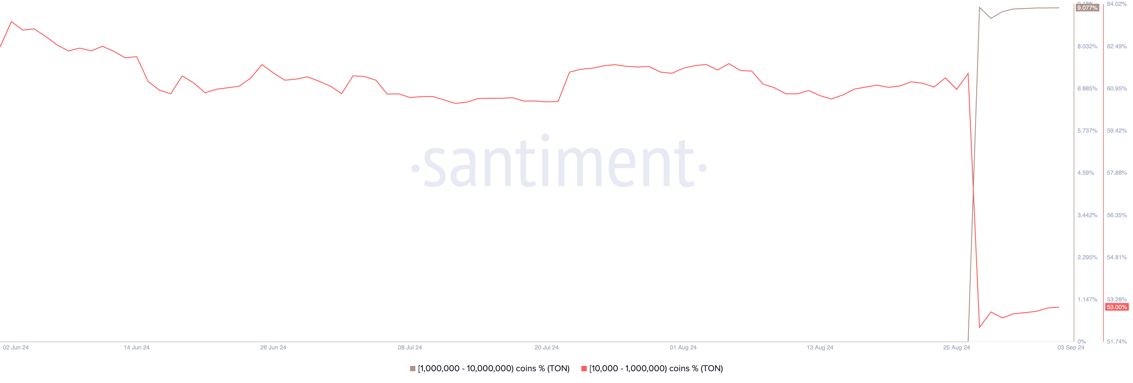 Co ciekawe, wieloryby TON postrzegają niedawny spadek cen jako okazję do zakupu. Według danych Santiment, ci dużi posiadacze zwiększyli swoje udziały w TON od czasu aresztowania Durova. Grupa wielorybów posiadająca między 1 mln a 10 mln tokenów TON kontroluje teraz 9,07% całkowitego obiegu altcoina.