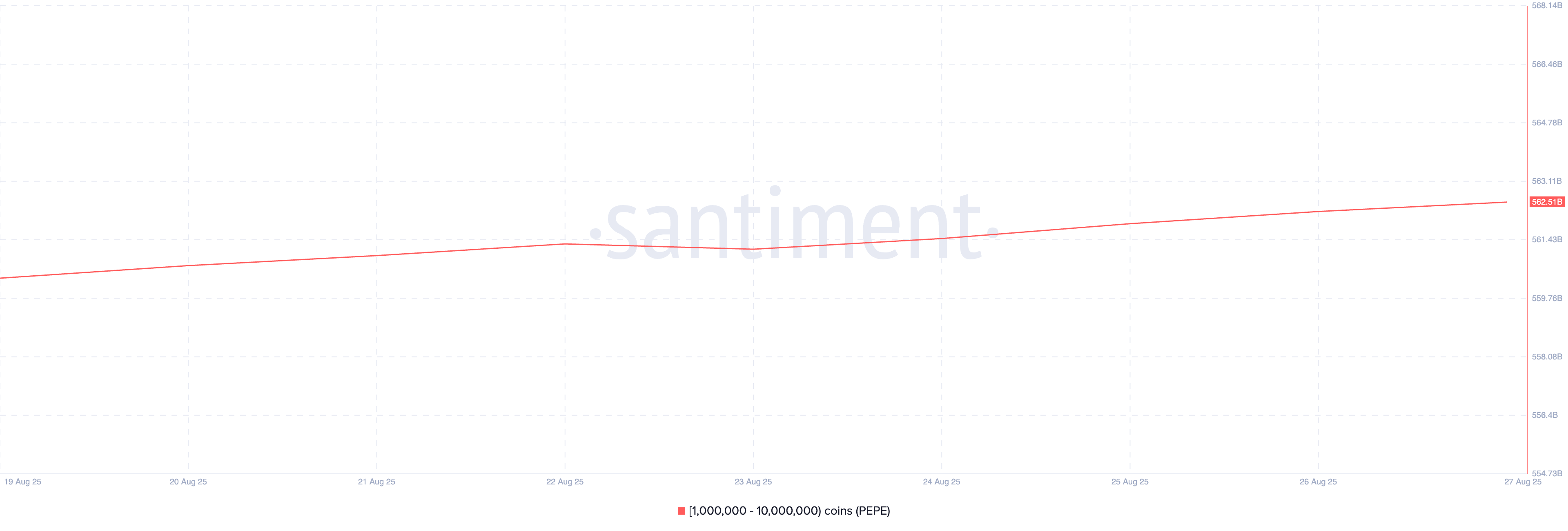 Memecoin o tematyce żaby, PEPE, przyciąga uwagę wielorybów kryptowalutowych przed wrześniem. Tymczasem według Santiment, posiadacze dużych portfeli zawierających od 1 miliona do 10 milionów PEPE zgromadzili 2,18 miliarda tokenów.