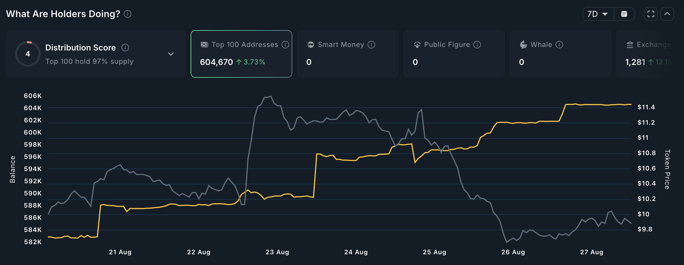 Zgodnie z danymi od Nansen, 100 największych adresów posiadających największe ilości UNI on-chain zwiększyło swoje zasoby o 4% w ciągu ostatniego tygodnia.