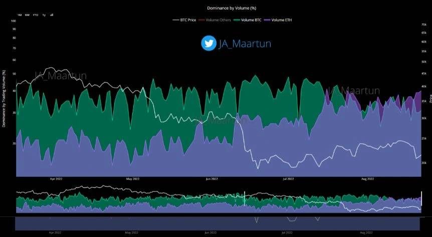 Jednocześnie warto zauważyć, że Ethereum było bardziej dominujące niż Bitcoin pod względem wolumenu obrotu przy dość licznych okazjach w sierpniu.
