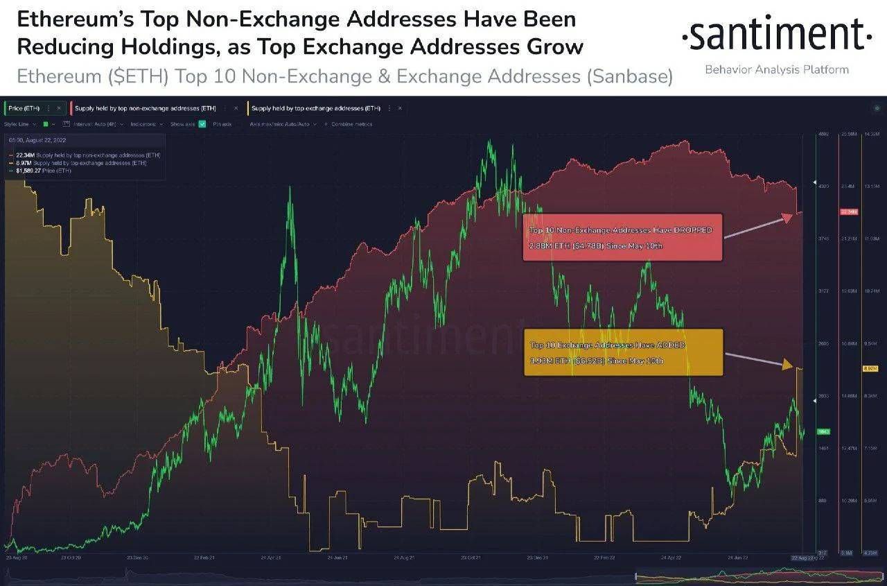 Według popularnej platformy analizy zachowań inwestorów Santiment, 10 największych nie giełdowych adresów Ethereum zmniejszyło swoje udziały. Rosnąć zaczęły jednak bilanse na giełdach.