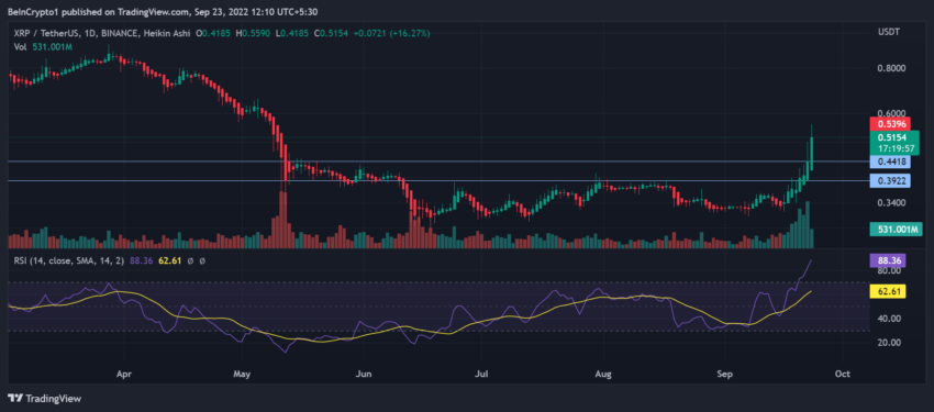 Cena XRP oscylowała przy granicy 0,536 USD w pisania tego artykulu, osiągając 27,27% zysku na wykresie 24-godzinnym i prawie 67% zysku na tygodniowym wykresie ceny.