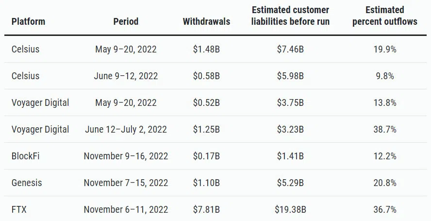 W badaniu wykorzystano zgłoszenia upadłościowe do scharakteryzowania odpływów środków klientów z pięciu platform. Były to BlockFi, Celsius, FTX, Genesis i Voyager Digital.