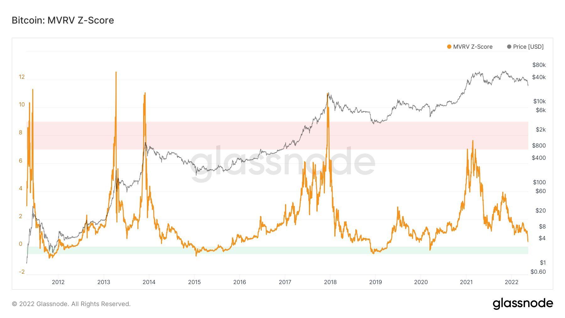 Zdaniem Clemente wskaźnik ten „od miesięcy znajduje się w obszarze ‘kupna’, a obecnie zbliża się do poziomów, które wcześniej wyznaczały pokoleniowe dołki”. Faktycznie, spoglądając na wykres widzimy, że wskaźnik znajduje się już zdecydowanie poniżej dołka z krachu COVID-19 w marcu 2020 roku. Ponadto jest bliski osiągnięcia obszaru z grudnia 2018 roku, gdy BTC spadł do poziomu 3150 USD.