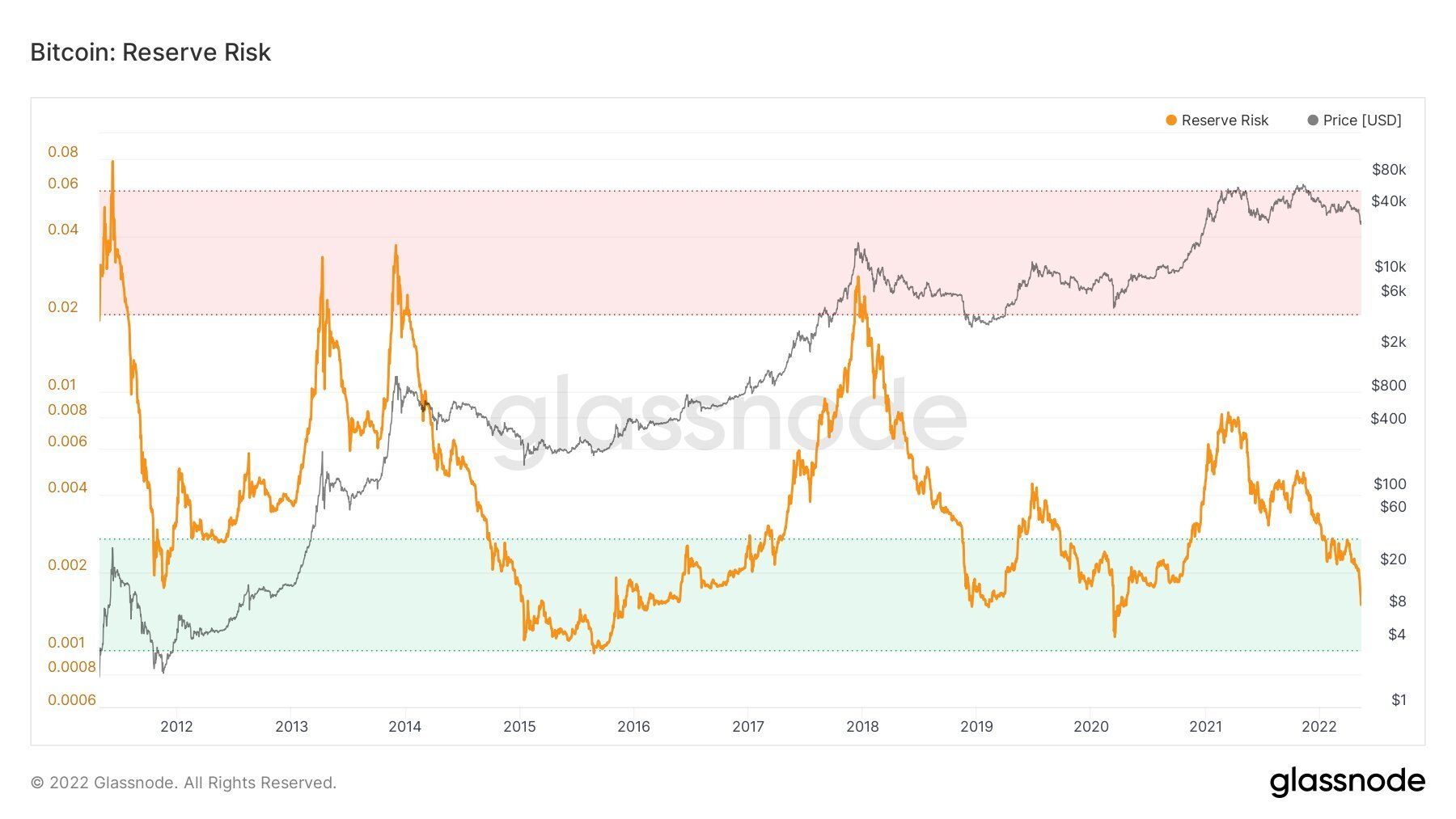 Następnie Clemente zwraca uwagę na Reserve Risk. Wskaźnik ten służy do oceny zaufania długoterminowych hodlerów w stosunku do ceny Bitcoina w danym momencie. Gdy zaufanie jest wysokie, a cena niska, to Reserve Risk osiąga niskie wartości. Gdy zaufanie jest niskie, a cena wysoka, to wskaźnik daje wysokie odczyty.