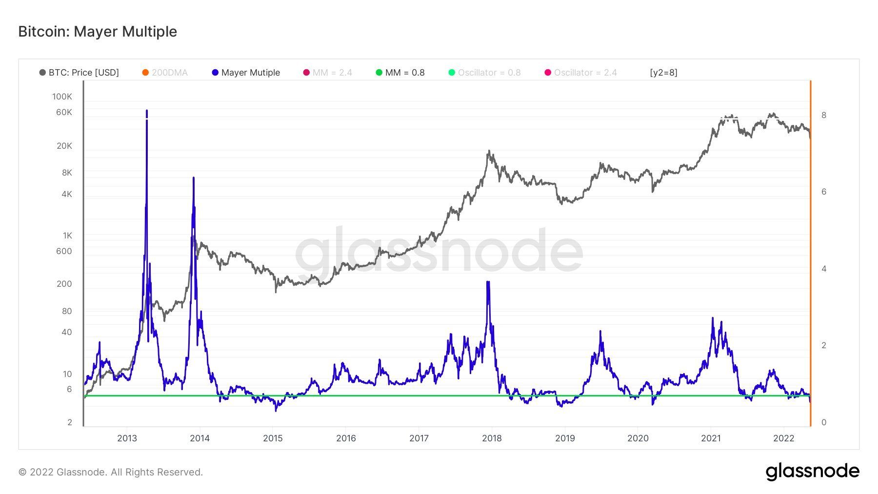 Piątym wskaźnikiem przestawionym przez analityka jest Mayer Multiple. Jest to oscylator, który oblicza się na podstawie stosunku ceny BTC do 200-dniowej średniej kroczącej (200D MA). Absolutne dołki Bitcoina były zwykle osiągane, gdy wskaźnik ten spadał zdecydowanie poniżej 1. Przykładowo dołek z 2018 roku doprowadził Mayer Multiple do wartości 0,53.