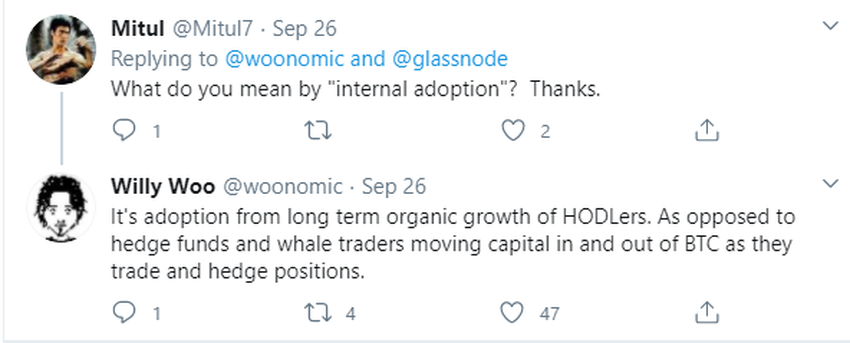 Według Woo Bitcoin zbliża się do punktu w swoim cyklu życia, w którym coś, co opisuje jako „adopcja wewnętrzna”, zaczyna wywierać większy wpływ na jego ruchy rynkowe niż inwestycje ze źródeł zewnętrznych. Wyjaśniając, co oznacza „adopcja wewnętrzna”, napisał w tweecie: