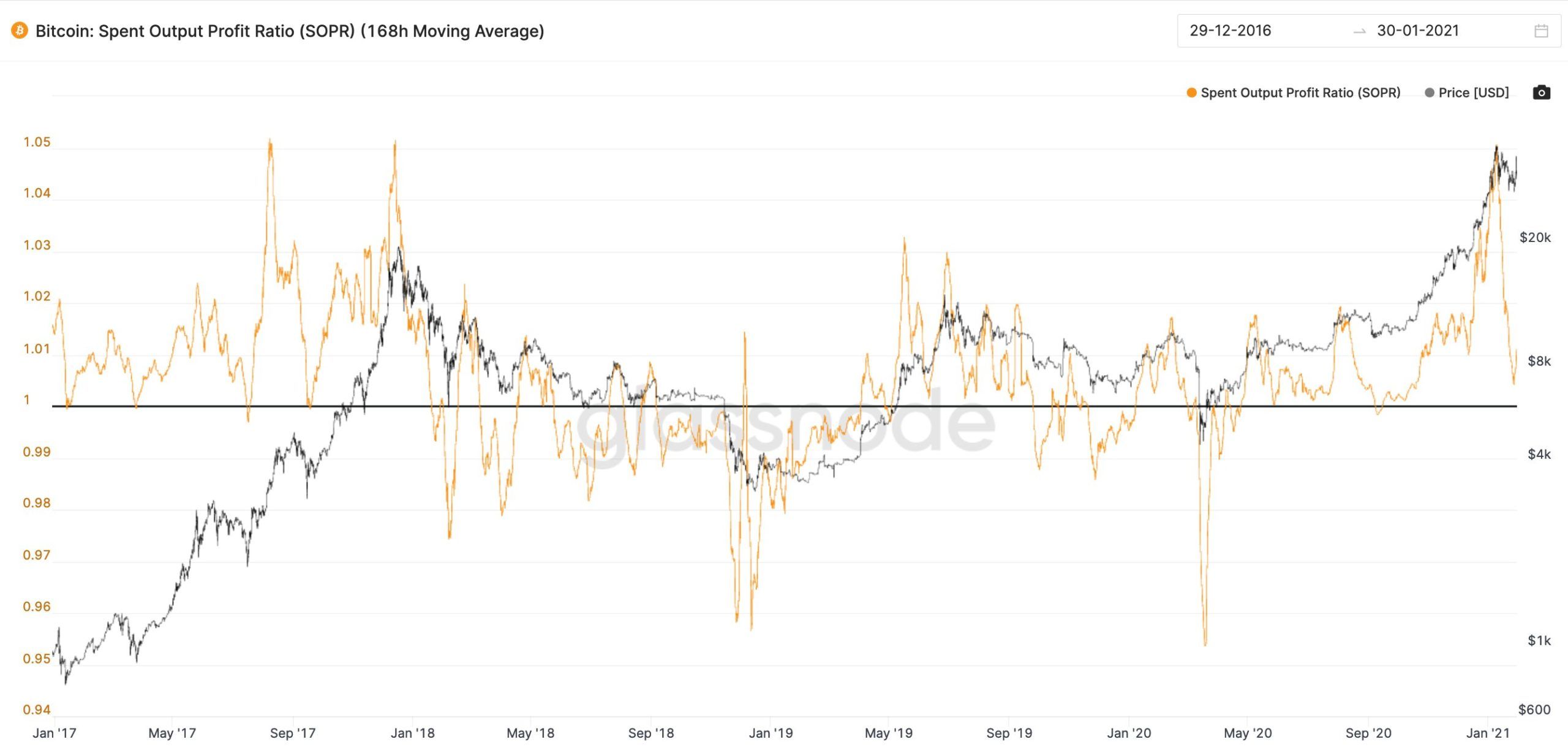 Uzupełnieniem perspektywy kreślonej przez wykres SPOR w długim terminie jest drugi wykres, w którym ten sam parametr jest uśredniony na wyższym interwale (168 godzin). Również w tym ujęcie można zauważyć poziom bliski resetu na rynku. Woo z przekorą nawiązuje do ostatniej pompy ceny Bitcoina przez Elona Muska, która zanegowała pełny reset parametru SPOR do linii 1.0.