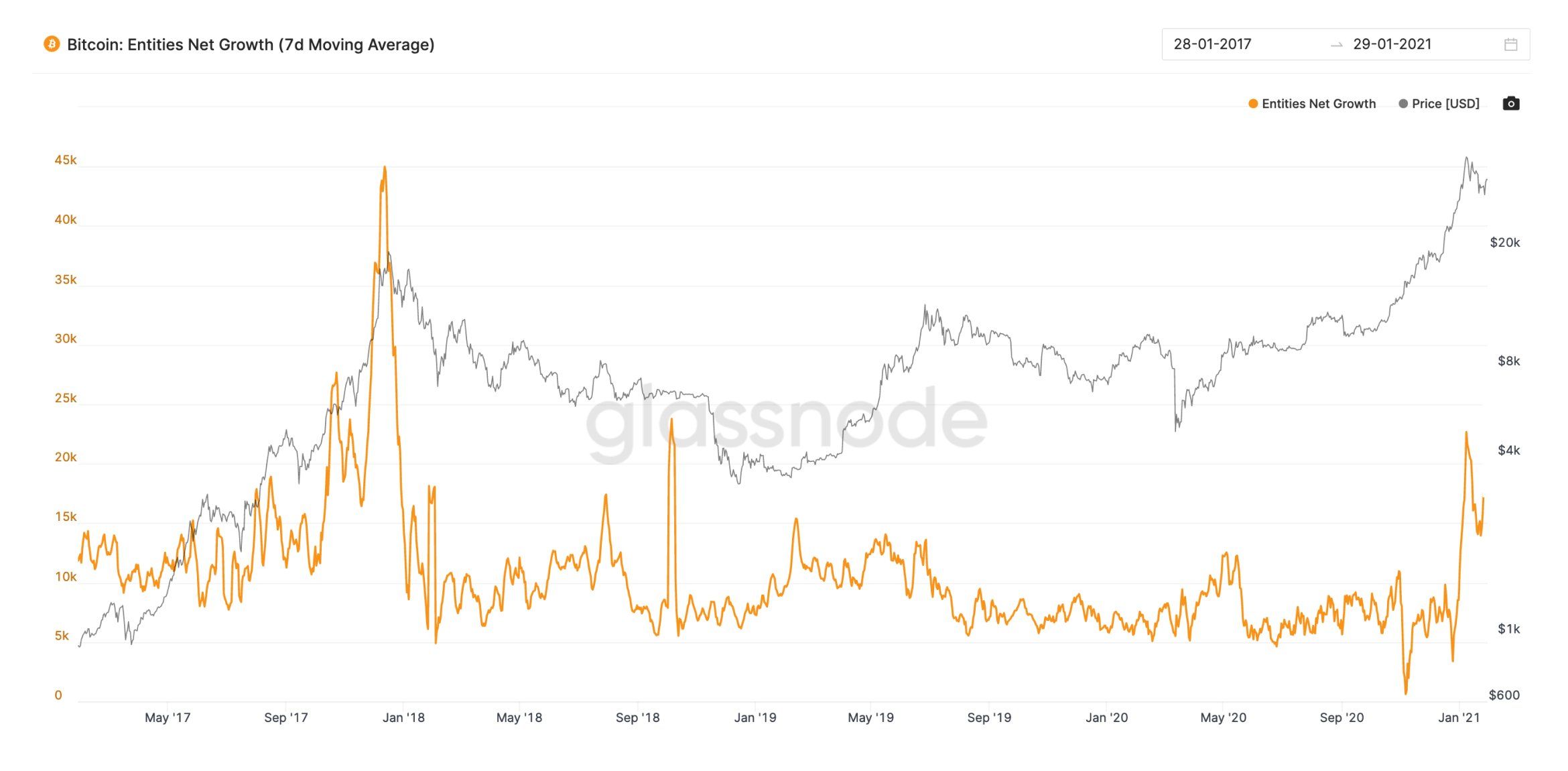 Następny wykres prezentuje wskaźnik ENG (Entity Net Growth), monitorujący napływ nowych użytkowników sieci Bitcoin. Woo zauważa, że pomimo trwającej konsolidacji wzrost liczby użytkowników jest wyższy niż w dowolnym wcześniejszym okresie trwającego cyklu. Innymi słowy wciąż pojawiają się nowe osoby, które kupują Bitcoina oraz generują swoje adresy i klucze.