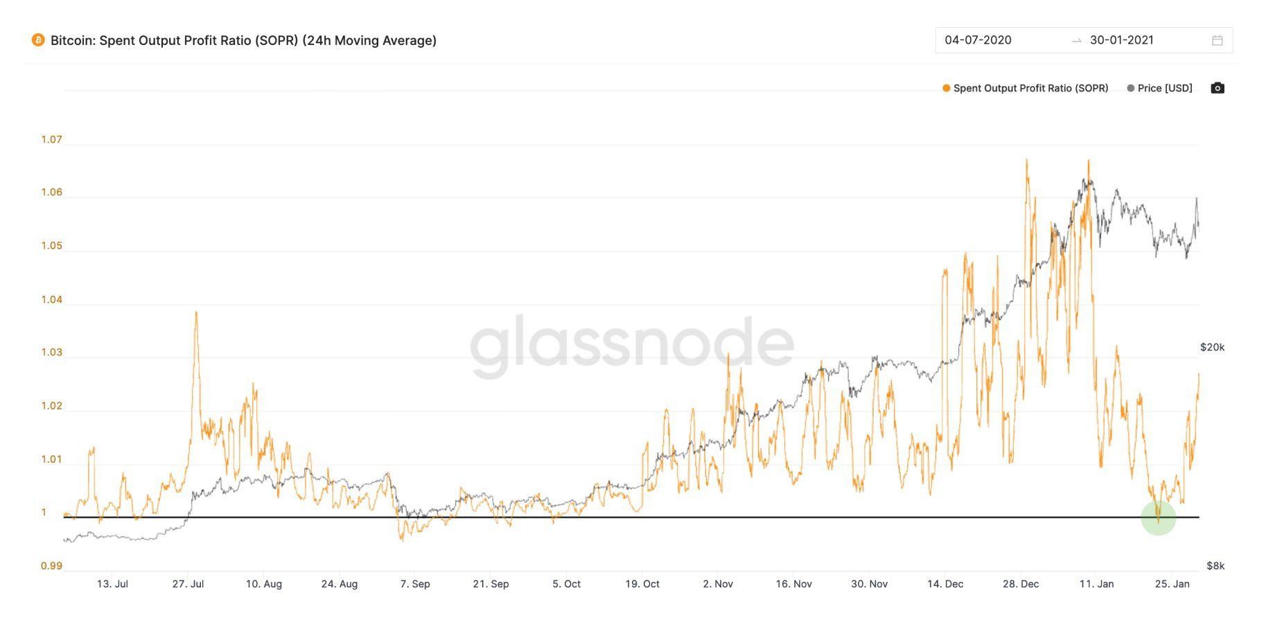 Pierwszy wykres, który przedstawia Woo, dotyczy parametru SPOR (Spent Output Profit Ratio). Ilustruje on poziom zysku pochodzący z bieżącej sprzedaży BTC. Jeżeli dotyka on poziomu 1.0 (zielone kółko), to ma miejsce reset na rynku. Stało się to w drugiej połowie stycznia.
