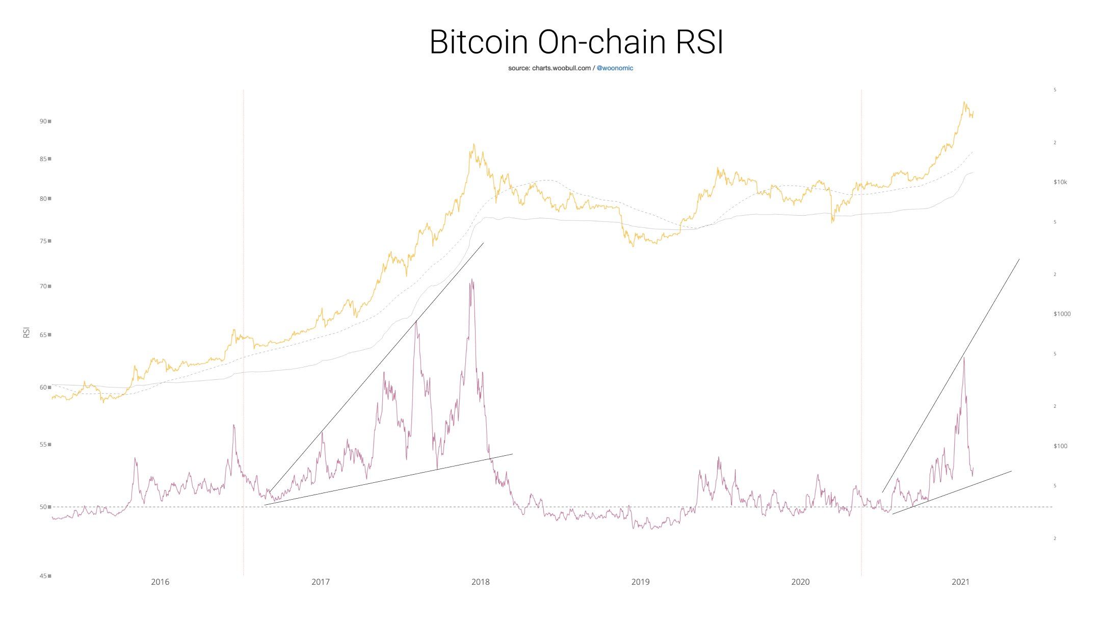 Na kolejnym wykresie widzimy rewelacyjnie zestawienie wartości RSI (Relative Strength Index) na blockchainie w tym i poprzednim cyklu. W obydwu przypadkach RSI odbijało się od granic wzorca rozszerzającego się klina (broadening wedge). Jak wynika z wykresu, aktualnie RSI jest bliskie odbicia od dolnej ściany tego wzorca.