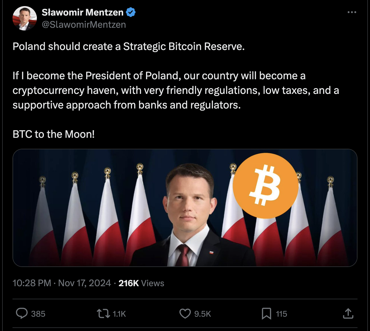 „Polska powinna stworzyć Strategiczne Rezerwy Bitcoina… Jeśli zostanę Prezydentem Polski, nasz kraj stanie się rajem dla kryptowalut, oferując bardzo przyjazne regulacje, niskie podatki oraz wspierające podejście banków i regulatorów.”